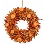 Krásně zdobený věnec bude pěknou podzimní dekorací na vchodové dveře i do interiéru. Věnec je kvalitně zpracován z přírodních materiálů, které jsou doplněny plastovými drobnými dýněmi, kuličkami a snítky suchých obilných klasů. Celý věnec je dokonale barevně sladěn do podzimních barev. Materiál: plast, textil, přírodní doplňky.