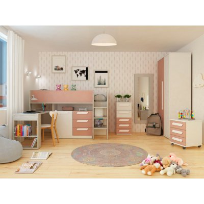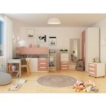 Dětský pokoj pro školačku, v kterém nebude nic chybět. Jeden z mnoha dalších návrhů, jak úsporně a ohleduplně vybavit dětský pokoj školačky. Pokud pro tento účel, máte jako rodiče k dispozici pouze malou místnost, pak tento návrh pro vás a vaši holčičku, může být dokonalým řešením. V hlavní roli je multifunkční dětská postel, která sama o sobě ušetří spousty místa. Další díly nábytku pak na dětskou postel navazují designem i barevnou kombinací odstínů. Dětský pokoj je v příjemném, jednotném provedení, kdy vše dává smysl.Dětský nábytek má v naší nabídce široké zastoupení a jednotlivé díly můžete pořídit rovněž samostatně, nebo návrh dětského pokoje může mít zcela jinou podobu. Třeba dáte přednost patrové posteli, nebo tradiční dětské posteli. Dětský pokoj v designu, který jinde nenajdete a vaše holčička bude mít rozhodně originální zázemí. Skladba dílů je zvolena v logických krocích. Dětská postel s psacím stolem a objemnými úložnými prostory, které nezabírají zbytečně místo. Kontejner na pojezdech, který bude vždy tam, kde holčička bude zrovna potřebovat. Dětská komoda na drobnosti a samozřejmě nesmí chybět šatní skříň. Dětský pokoj, v kterém vaší holčičce nebude opravdu nic chybět. Věříme, že vás příjemně osloví rovněž velmi kvalitní zpracování a certifikace nábytku. Dětský nábytek, která vám představujeme v exkluzivním zastoupení od španělského výrobce a tak máte jistotu, že vašemu školákovi pořizujete nábytek v designu, který jinde nenajdete. Rodiče pak zcela určitě potěší doručení našimi vozy bez poškození s možnosti výnosu.Dětský pokoj, dokonalé řešení i malého prostoruv ceně návrhu multifunkční postel, komoda, kontejner, šatní skříňv ceně postele rošt v podobě větrané desky pro větší stabilitu a pevnostrozměr místa na spaní o velikosti 90x200 cm, nosnost 90 kgdoporučujeme matraci výšky 15 cmmožnost zrcadlového sestavení postelekomoda výšky 98 cm, šíře 45,2 cm, hloubka 46,2 cmkontejner výšky 60 cm, šíře 45,2 cm, hloubka 46,2 cmšatní skříň výšky 223 cm, šíře 90,