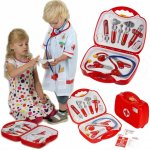 KL 4350 Lékařská souprava s buňkou Souprava s buňkou patří k nejpůsobivějším z celé lékařské řady. Obsahuje kompletní a nezbytné vybavení pro každého zdravotníka. Červený kufřík je vyroben z velmi odolného plastu, má pohodlné držadlo na přenášení a žlutý klip proti otevření. Na přední straně, pod průhledným víkem, se nachází hrací mobilní telefon, který musí být vždy po ruce. Tato sada obsahuje až 14 kusů. Všechny dílky jsou samozřejmě bezpečné pro děti a snadno se používají. Kufřík obsahuje červený a modrý plastový stetoskop, hračkový mobilní telefon (jsou nutné baterie, které nejsou součástí balení), injekční stříkačku, teploměr, nůžky, otoskop, kladívko, náplast, odznak, obvaz zdravotní sestry, krabičku na obvazové polštářky, recept a lékařskou měřící kartu. Řada lékařských souprav a doplňků jednak slouží ke hře na lékaře či zdravotní sestru, jednak pomáhá dětem seznámit se s tématem návštěvy lékaře, prováděnými vyšetřeními a zákroky. K dispozici je široká škála sad s větším či menším množstvím doplňků a také řada jednotlivých výrobků, jako jsou lékařské pláště a stetoskopy. Celá série je vizuálně navržena tak, aby si s ní mohli hrát jak chlapci, tak dívky..